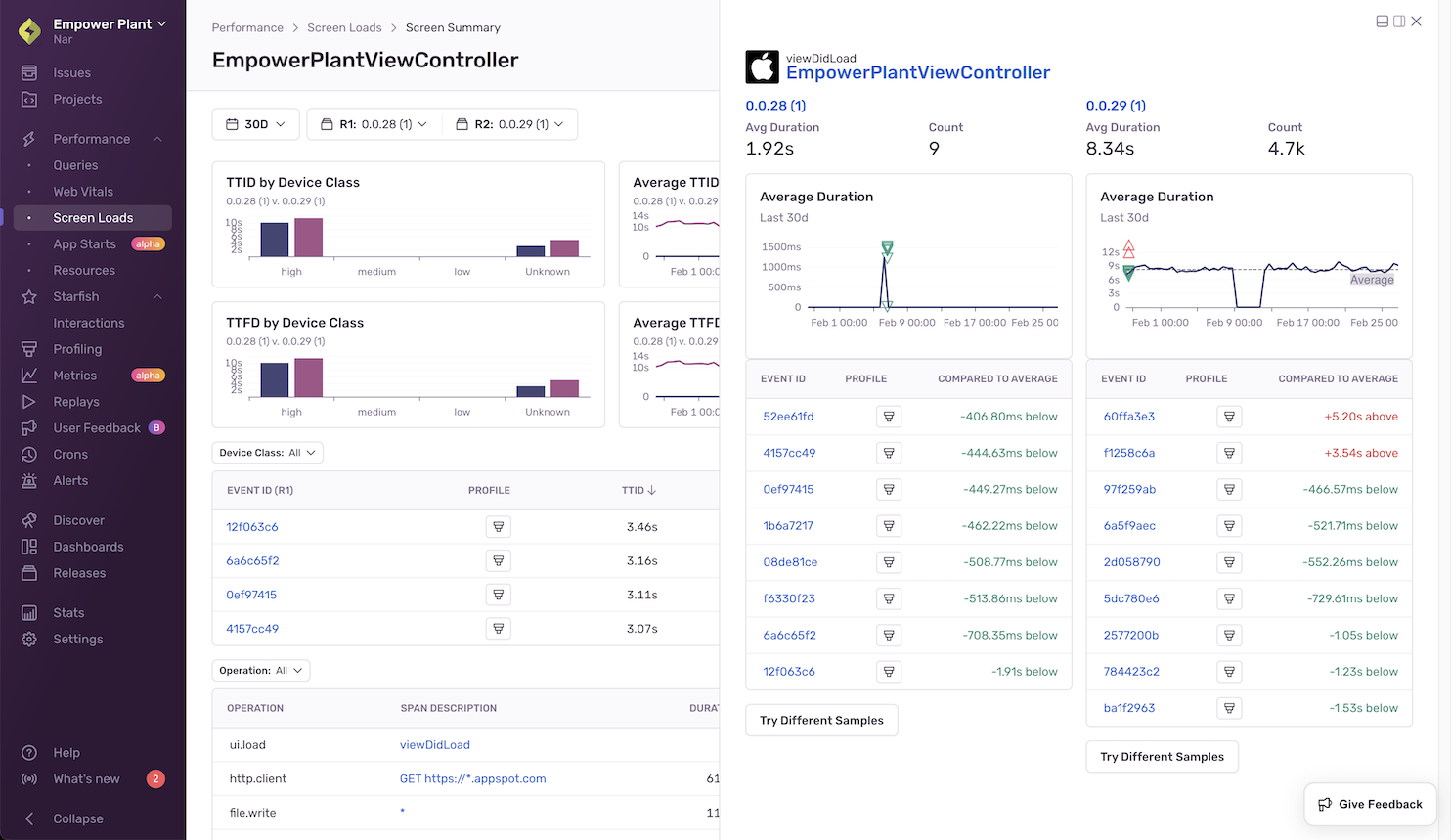 In the table below, you’ll see a list of sampled events and profiles (if they exist). By comparing the two, you’ll be able to see how much the duration of the span you’re looking at deviates from average spans in each of the two releases you’ve selected.